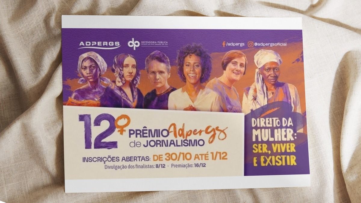 Estão abertas até 1º de dezembro as inscrições para o '12º Prêmio Adpergs de Jornalismo'. Promovida pela Associação dos Defensores Públicos do Rio Grande do Sul (Adpergs), a edição deste ano tem como tema 'Direito da Mulher - Ser, viver e existir'. O concurso visa reconhecer produções jornalísticas que destaquem a atuação de defensoras e defensores públicos na promoção e garantia dos direitos das mulheres em diferentes contextos sociais.